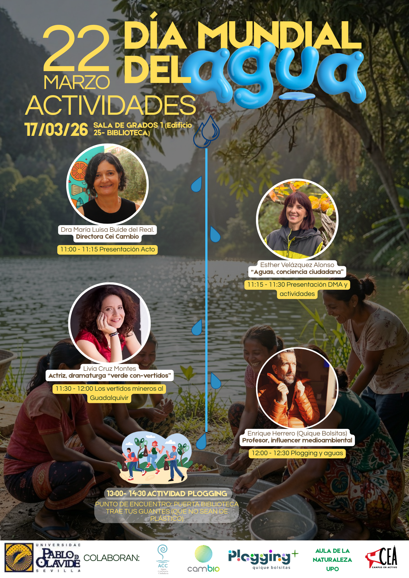 Con motivo del Día del Agua, la Universidad Pablo de Olavide ha organizado en colaboración con CEI Cambio una serie de actividades para conmemorar esta efeméride. En concreto, celebrarán una mesa informativa en el EcoMercado, una jornada con charlas de dos activistas medioambientales (Livia Cruz Y Enrique Herrero -conocido como Quique Bolsitas-), y una actividad de Plogging en la zona del río Guadaíra que pasa por el Campus universitario.