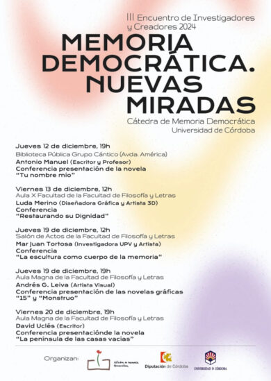 Entre los días 12 y 20 de diciembre, la Cátedra de Memoria Democrática de la Universidad de Córdoba organizará su III Encuentro de Investigadores y Creadores, este año dedicado a la memoria como recurso creativo. Bajo el título “Memoria Democrática. Nuevas Miradas”, pretende acercar al público en general -y al especializado- cómo se está abordando la memoria democrática desde diferentes y vanguardistas lenguajes creativos.