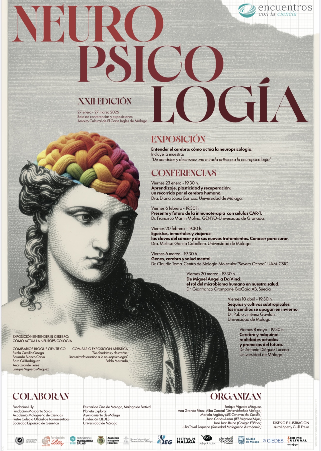 La XXII edición del ciclo de conferencias y exposiciones, que en esta ocasión gira alrededor de la neuropsicología. S organizan tres conferencias alrededor del estudio del cerebro y enfermedades mentales: desde el punto de vista de la Neuropsicología (Diana López, Universidad de Málaga), Genética (Claudio Toma, Centro de Biología Molecular “Severo Ochoa”, UAM-CSIC) y Ética (Antonio Diéguez, UMA). Y por supuesto, siempre contamos con temas de actualidad, dos de ellas relacionadas con el cáncer: su tratamiento con el estudio de terapias con células CAR-T, un novedoso tipo de inmunoterapia personalizada contra el cáncer consistente en modificar genéticamente los linfocitos T del propio paciente para que reconozcan y destruyan células tumorales específicas (Francisco Martín, Universidad de Granada-GENYO) y las bases moleculares de la angiogénesis, formación de nuevos vasos sanguíneos a partir de vasos ya existentes, con un papel clave en enfermedades como el cáncer (Melissa García, UMA), el estudio del Microbioma humano, conjunto de microorganismos y sus genes que viven en nuestro cuerpo y que tienen un papel esencial para la salud (Gianfranco Grompone, BioGaia-Suecia) y, por último, el eterno problema Sequías-cultivo especies subtropicales en la Axarquía-Málaga (Pablo Jiménez, UMA).