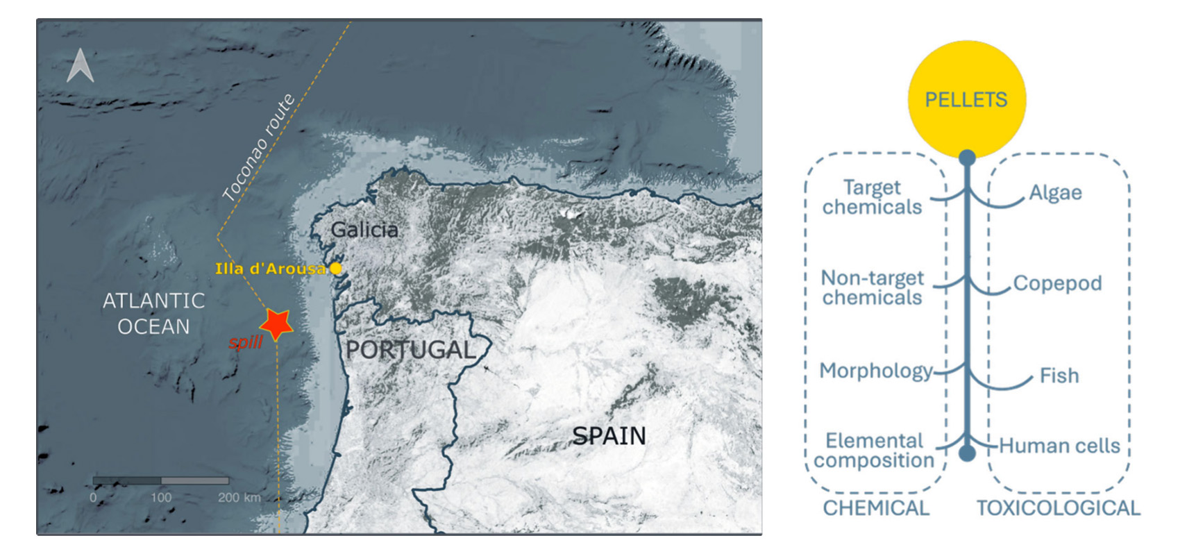 Esta investigación combina técnicas de caracterización química con ensayos de toxicidad en distintos modelos biológicos. Para ello, se evaluaron pellets recogidos en una playa afectada de Galicia, junto con extractos y lixiviados acuosos, mediante pruebas con una microalga (Raphidocelis subcapitata), un copépodo marino (Apocyclops royi), un modelo de pez (Danio rerio) y una línea celular humana.
