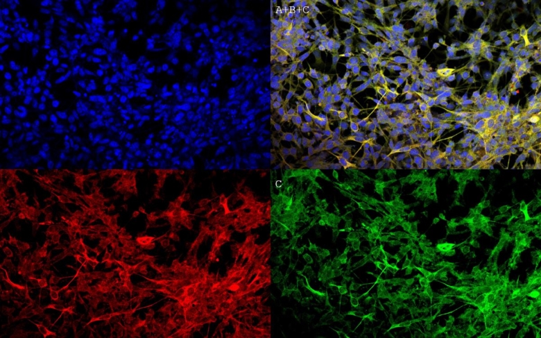 La imagen muestra células embrionarias SN4741 cultivadas en laboratorio sobre una placa de cultivo y tratadas con material grafénico para inducir su diferenciación. Este proceso se evidencia mediante un triple marcaje fluorescente, que permite identificar distintas características de las células.