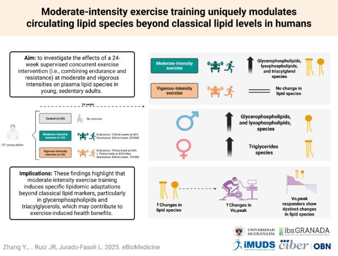 Ahora, un estudio de la Universidad de Granada ha descubierto que el entrenamiento de intensidad moderada provoca un aumento significativo en los niveles plasmáticos de diversas especies lipídicas, especialmente glicerofosfolípidos y triglicéridos. Esto se asocia a mejoras en la capacidad cardiorrespiratoria (también conocida como consumo máximo de oxígeno), un marcador muy importante del estado general de salud. “Curiosamente, esta respuesta no se ha observado con el entrenamiento de intensidad vigorosa o de mayor intensidad”, apunta Lucas Jurado Fasoli, autor principal del artículo que sustenta esta investigación, publicado en la revista eBioMedicine.