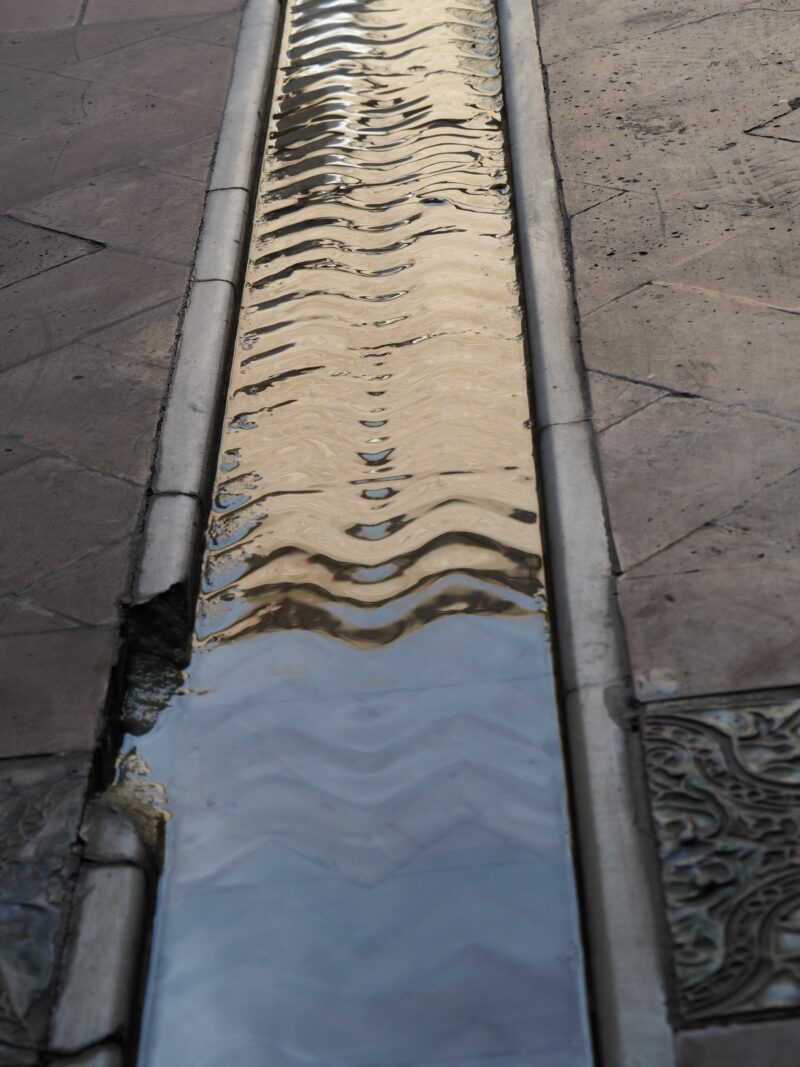 Conducción de agua en la Sala de la Justicia, con turbulencias producidas por las hendiduras en la piedra.