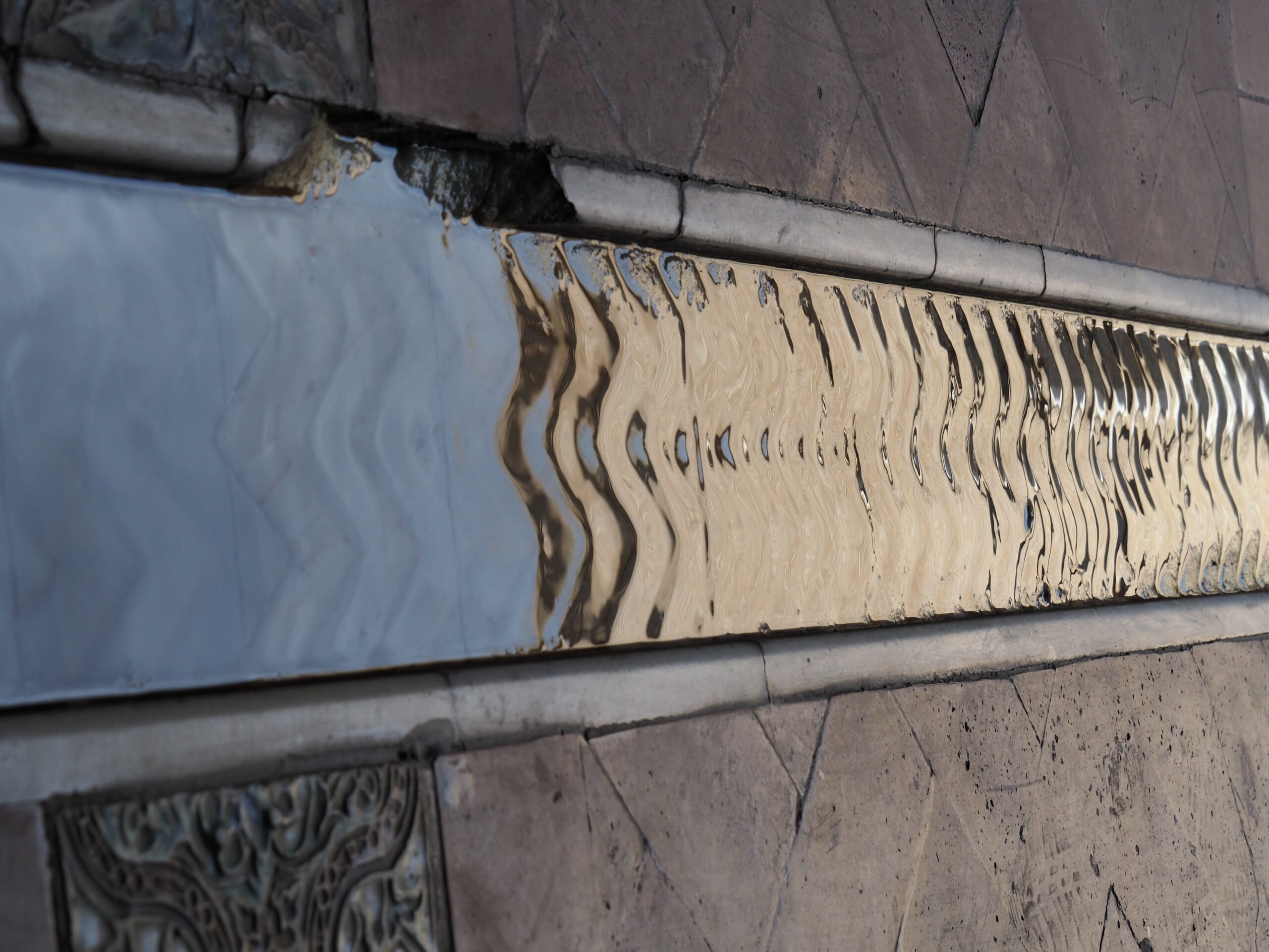 Este zigzag esculpido en el mármol pasó a la decoración. Ya sin ninguna función sobre la percepción del agua, más que la de su representación figurada. Transita así de la función a la forma, un proceso muchas veces repetido en la arquitectura histórica. Y como forma ahora geométrica, se repite en tazas de fuentes, estilizando sus ángulos y duplicando sus líneas de borde, para subrayar su presencia. Así ocurre en la taza (reutilizada) de la fuente del Patio de Lindaraja, hoy expuesta en el Museo de la Alhambra de Granada, y de la que copian varias fuentes restituidas recientemente, o en otras tazas de fuentes andalusíes.